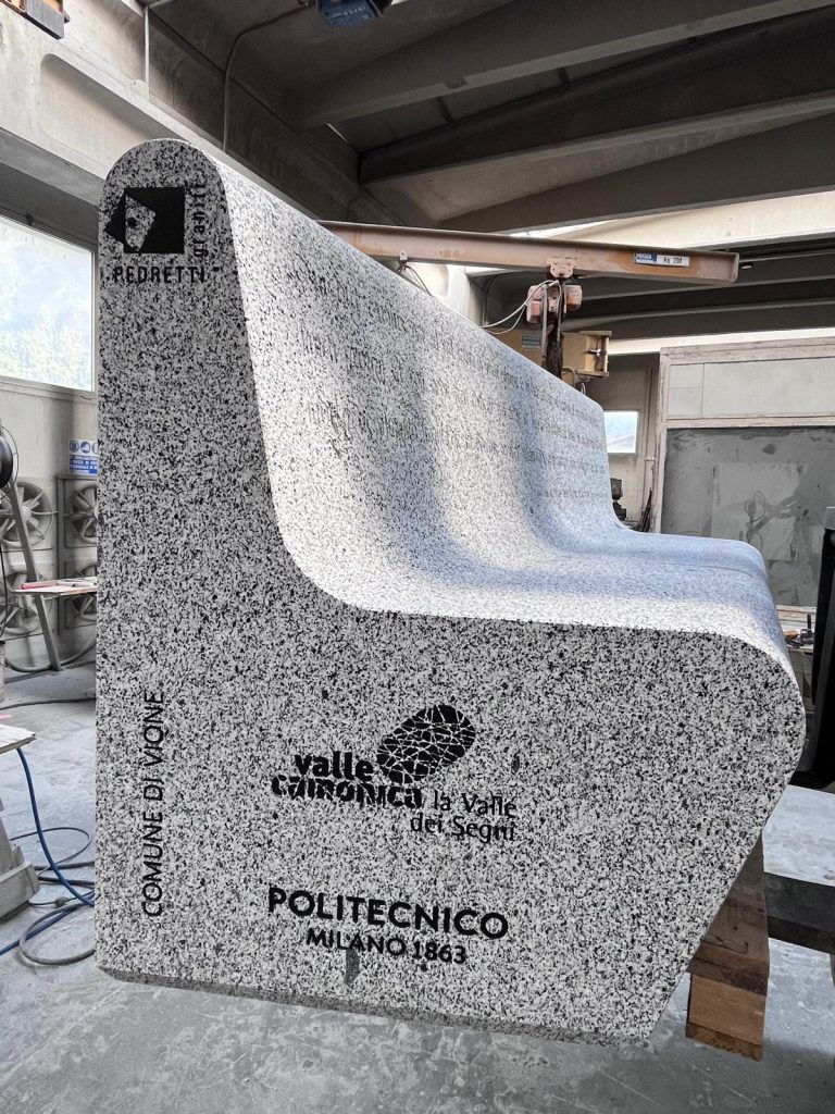 La tonalite è stata tagliata con filo al diamante e lavorata con una macchina a 5 assi. Le superfici sono state fresate, di modo da rendere indelebili le scritte. Così come indelebili sono le incisioni rupestri della nostra valle. Le fresature evidenziano il percorso del leggendario passaggio di Carlo Magno da Vione, che portò con sé un’indulgenza di 400 anni. Il tracciato si basa sulla scansione dell’affresco che il Baschenis realizzò nel XVI secolo nella Chiesa di Santo Stefano a Carisolo, in Val Rendena.