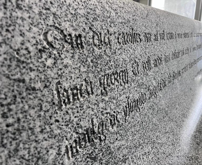 La tonalite è stata tagliata con filo al diamante e lavorata con una macchina a 5 assi. Le superfici sono state fresate, di modo da rendere indelebili le scritte. Così come indelebili sono le incisioni rupestri della nostra valle. Le fresature evidenziano il percorso del leggendario passaggio di Carlo Magno da Vione, che portò con sé un’indulgenza di 400 anni. Il tracciato si basa sulla scansione dell’affresco che il Baschenis realizzò nel XVI secolo nella Chiesa di Santo Stefano a Carisolo, in Val Rendena.